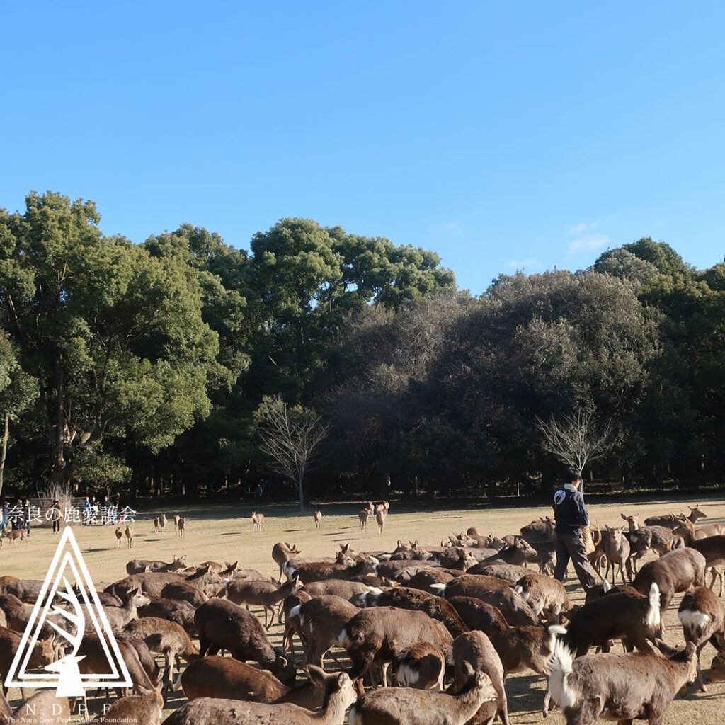 この日も天気に恵まれ、青空の下で鹿寄せが行われました。