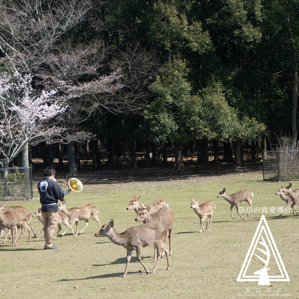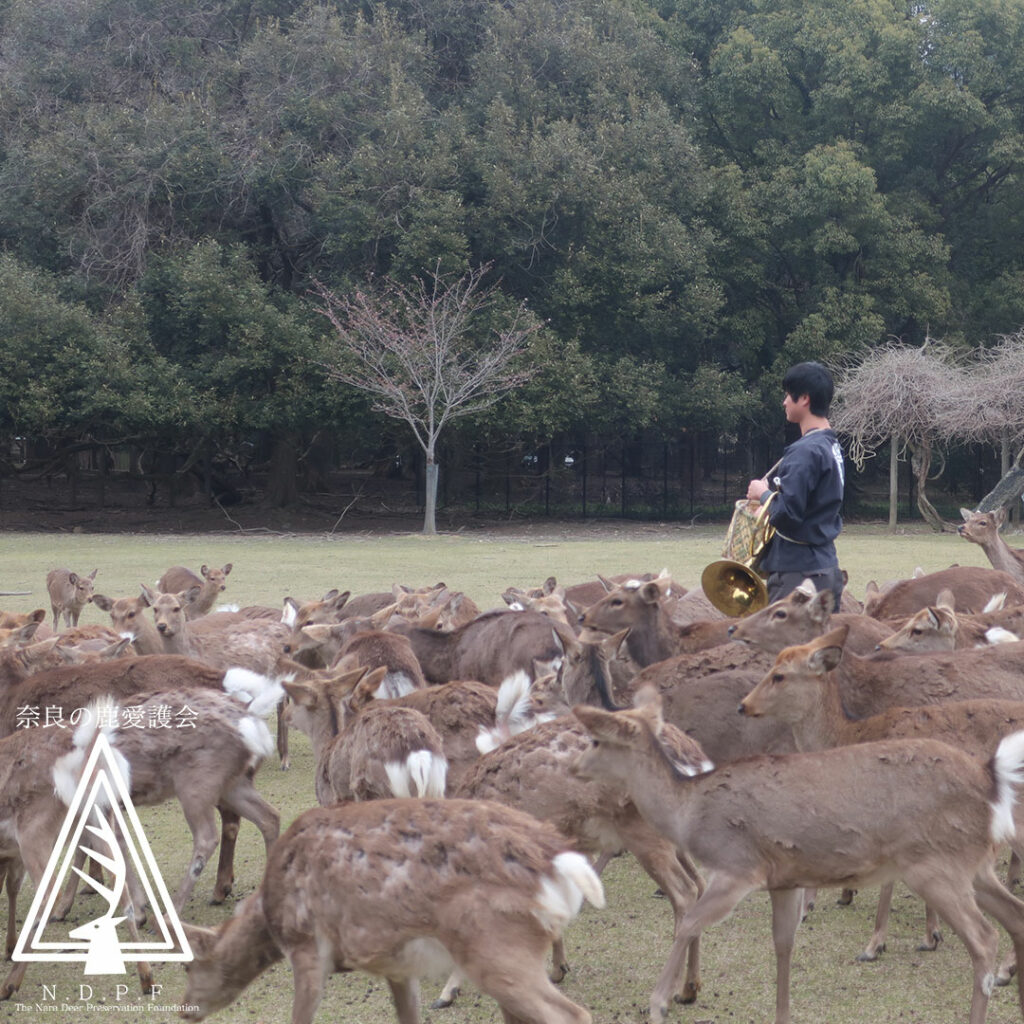 ナチュラルホルンの音色に反応し、次々と駆け寄ってくる鹿たちの姿は、奈良ならではの穏やかな日常そのものです。