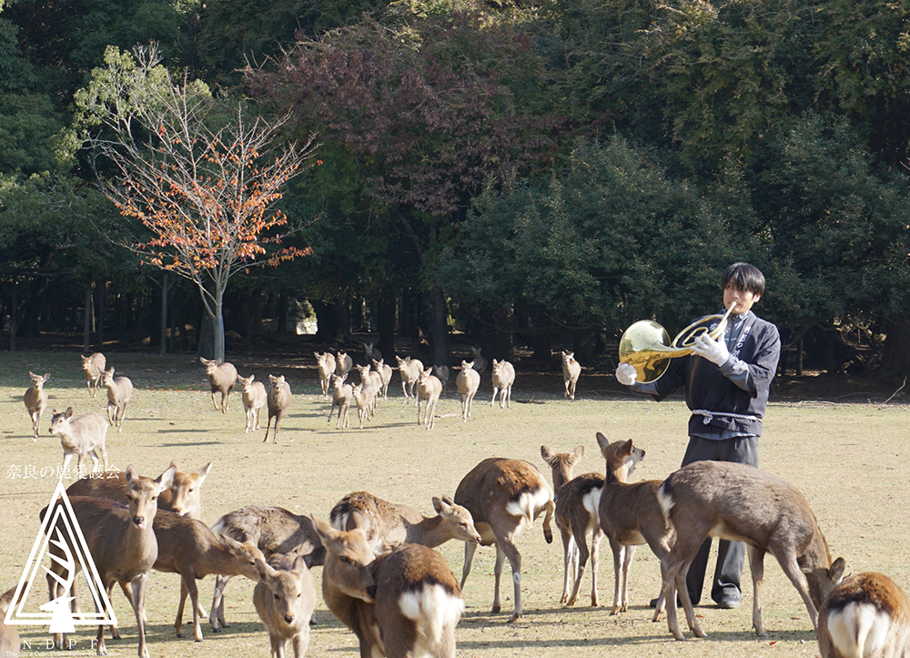 ナチュラルホルンの音が鳴ると、東側の森からたくさんの鹿が走ってやってきます。