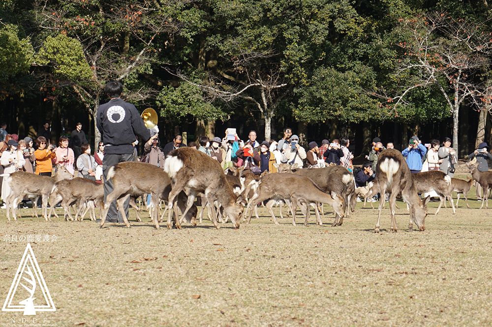 また、観覧されている皆さまの背後からも鹿が現れることがありますので、後ろから来る鹿のために少し間隔をあけていただけますと幸いです。